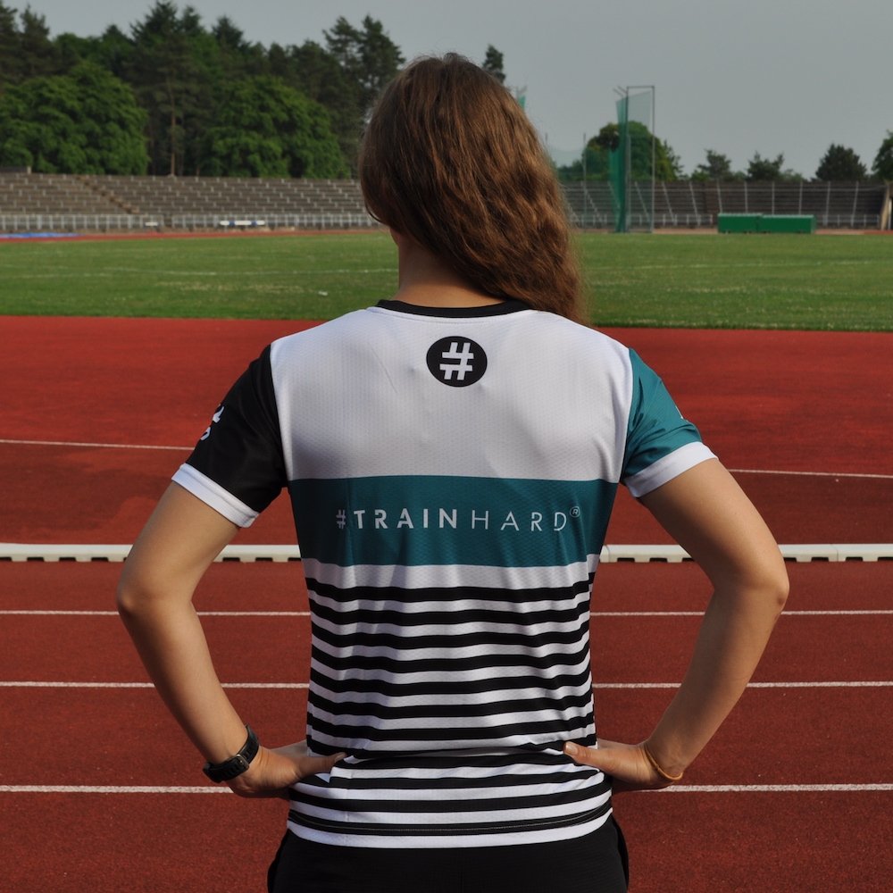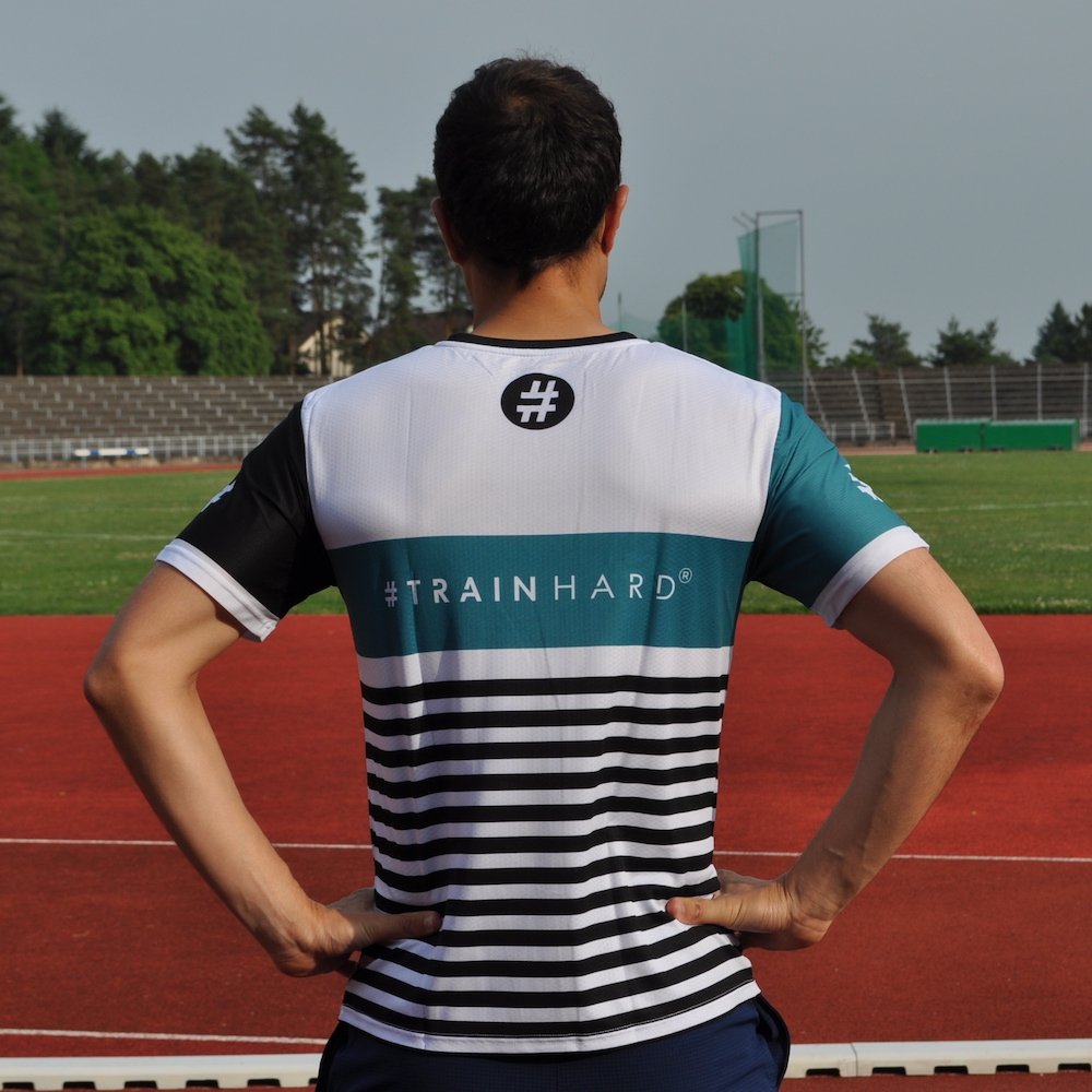 T-shirt modèle homme ou femme, à séchage rapide, avec #trainhard sur le devant, et # sur le haut du dos. Idéal pour la pratique du running, ou des sports en salle.